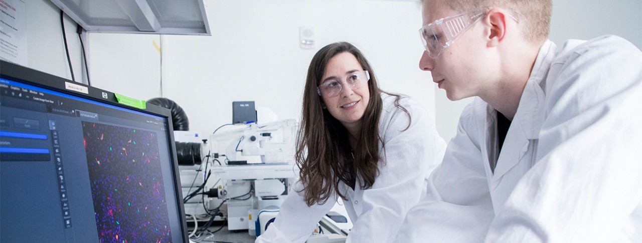 Main image: Postdoctoral researcher Lindsey Plasschaert of Novartis and graduate student Rapolas Zilionis of Harvard Medical School review visual markers of a new airway cell type. Photo by PJ Kaszas