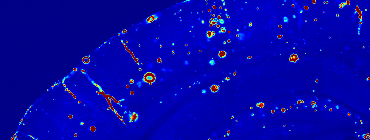 Main image: Beta-amyloid protein (in red) is beginning to accumulate in this brain tissue. Researchers suspect that it plays a role in the onset of Alzheimer’s disease. Image: Nikita Rudinskiy/Novartis