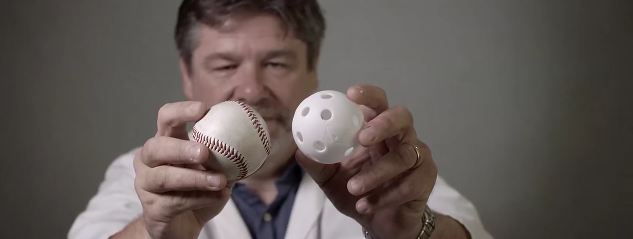 Weers realized he knew an object that would curve in just the right way – the plastic balls he used as a boy in baseball practice. These hollow, perforated balls move much more slowly than solid baseballs and are easier to coax into a curving trajectory. "We could do some wicked things with these plastic children’s balls in terms of spins and curves, and that’s what got me thinking."